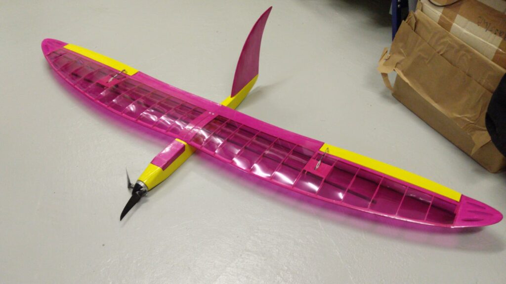 De vleugel is gefolied met transparante folie van HK. Het geel is oracover. Verschil in verwerken is er eigenlijk niet. Echter als je de folie van H verwijdert blijft een deel van de kleurlaag achter, iets dat je bij Oracover minder is. Het spannen van de vleugelfolie heb ik met een föhn gedaan waarbij de temperatuur in te stellen is. Heel rustig de temperatuur verhogen en dan voorzichtig de folie spannen. Werkt perfect.