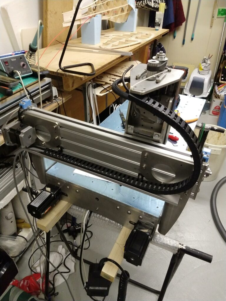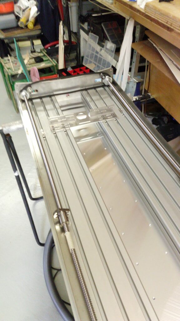 In bovenstaande foto is duidelijk te zien dat de tandriemwielen zijn aangebracht die zorgt voor de synchronisatie van de beide x-assen. Deze is 850mm echter we hebben in combinatie met de 2 20 tands wielen minder lengte nodig, of we moeten het aantal tanden verhogen. de 850 mm riem wordt met spanners op spanning gebracht en past dan ook op 20 tands wielen. De sanner die de riem op spanning gaat brengen moet nog worden gemaakt en aangebracht. Verder is ook het tafelblad van 10 mm aluminium op de profielen aangebracht. In de profielen zijn sleufmoeren aangebracht waarin 6 mm imbusbouten worden ingedraaid.