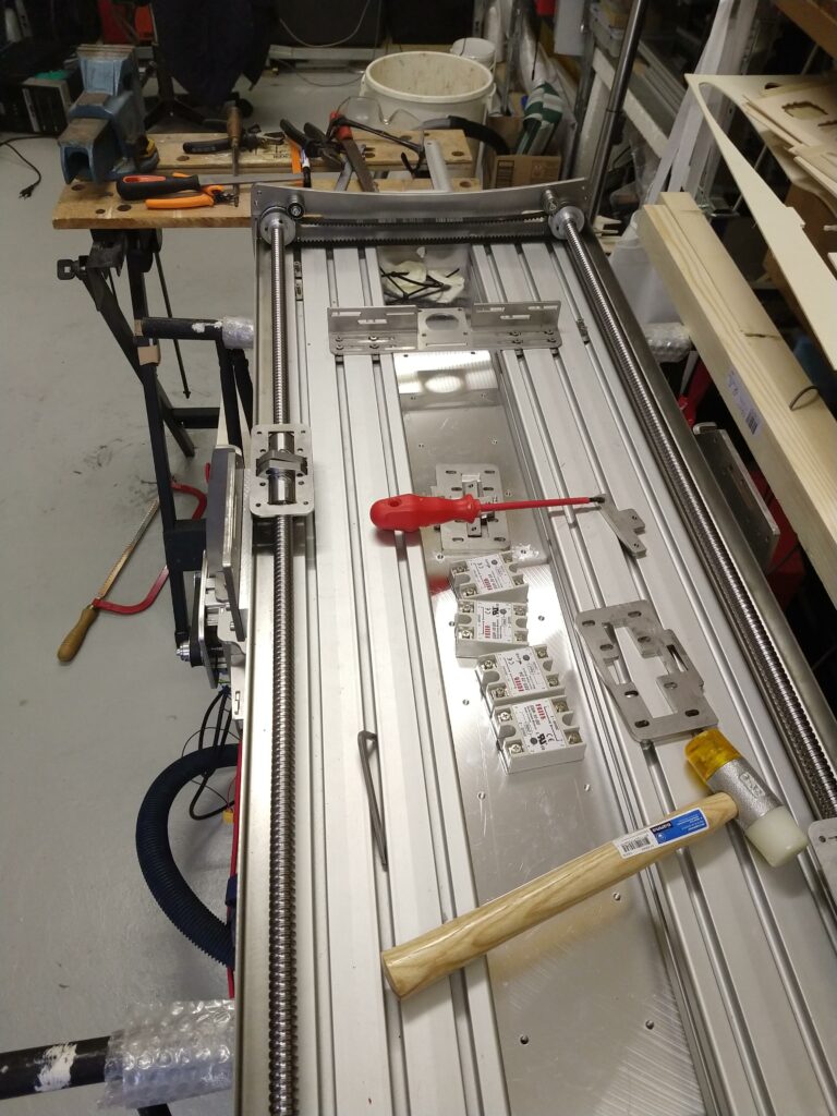 Na de update van april dit jaar is er weer een update :-). Dit keer zijn de X-as spindels aan de beurt en is de tafel voorzien van een aluminium plaat. Deze laatste is 1 cm dik en voorzien van gaten met m6 draad zodat je op de plaat klemmen en andere spullen kunt vastzetten om materiaal vast te zetten om dit te kunnen bewerken.
