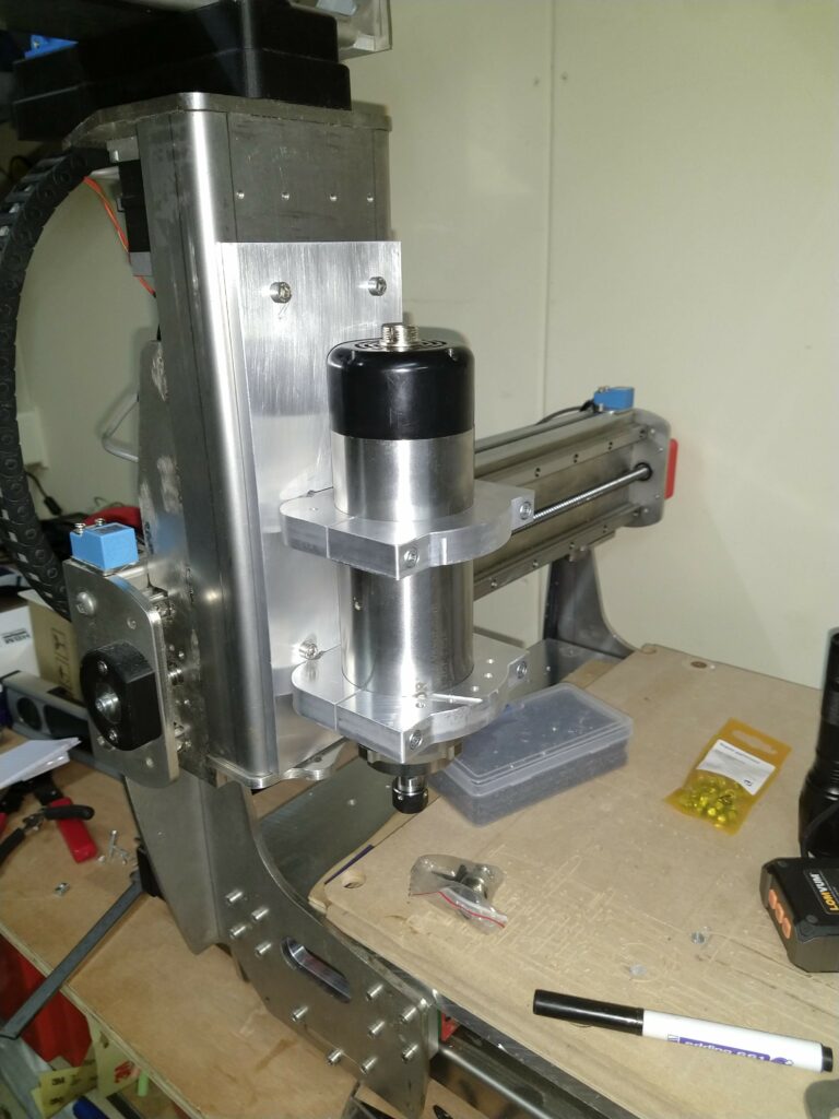 In april 2021 de machine afgerond en in gebruik genomen. Met de kress spindel die ik al had kon ik prima werken. Alleen maakt dat ding zo’n lawaai dat ik toch maar een spindel met hf deel heb gekocht bij ali. Meteen spantangetjes erbij gekocht zodat ik de meeste boortjes en schachtjes kan inspannen: 1 – 8 mm en 1/8″ en 1/4″