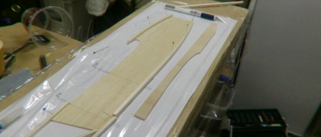 De rechterkant wordt op de linker zijkant opgebouwd. Hiermee krijgen we dat de linker en rechter romp zijkant gelijk zijn. Spelt R1 vast op de linker zijkant t.h.v. de hulplijst.Aan de zijkant van de romp steek ik spelden in de bouwplank zodat de buitenzijde van de romp is gemarkeerd en hiertegen kunnen dan de liggers worden geplaatst.