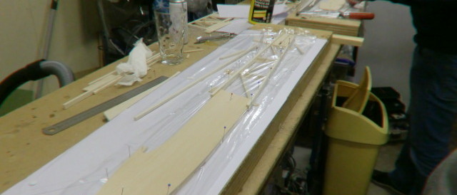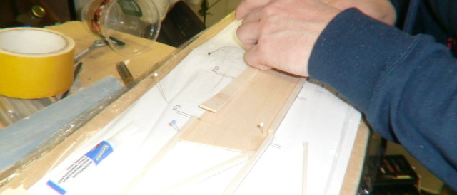 Als de zijkant geheel is verlijmd en gedroogd, dan halen we de spelden eruit waarmee deze op de bouwplank zit. De rechter romp zijkant wordt omgedraaid en deze ligt met de vlakke kant boven.Onder R1 wordt een hulplijst van 3 mm balsa gelegd van een reststuk balsa.