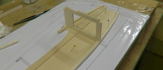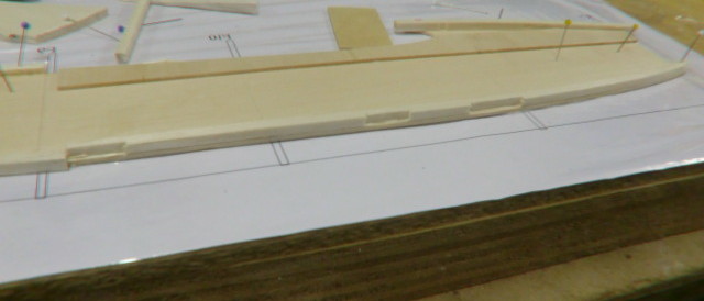 Snij/Zaag de dwarsliggers en schuur deze op maat als ze te lang zijn. Plaats beginnend vanaf R1 de dwarsliggers en lijm deze vast. Daarna maken we de schoring tussen de dwarsliggers in de lengte van de romp volgens tekening.