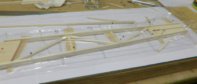Tot slot worden in de 5mm lijsten die op R1 en R2 zijn gelijmd de uitsparingen gemaakt waarin de 2 mm triplex delen R14 en R15 komen te zitten voor het bevestigen van het landingsgestel.