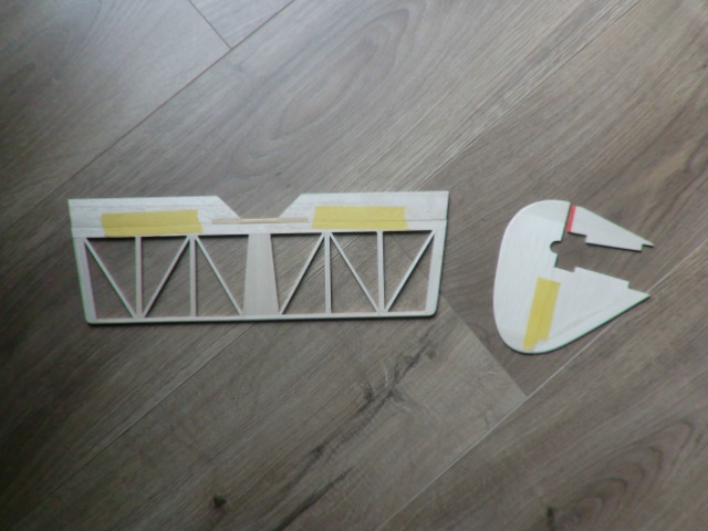 Het stabilo wordt opgebouwd uit 5 mm medium balsa. Latjes snijden van  5×10, 5×5 en 5×3 mm. En vervolgens alles op de tekening bouwen. Het kielvalk en richtingroer bestaat uit 3 mm balsa en worden volgens tekening gesneden. Hierbij een kleine wijziging doorgevoerd: ca. 15 mm aan boven en onderzijde van het richtingroer afgehaald en haaks op de nerf van het overblijvende stuk 2 stukken gelijmd van 15 mm hoog. Vervolgens het geheel in vorm gesneden/geschuurd. Voor het hoogteroer had ik nog driehoeklijst liggen en met een kleine aanpassing deze gebruikt.